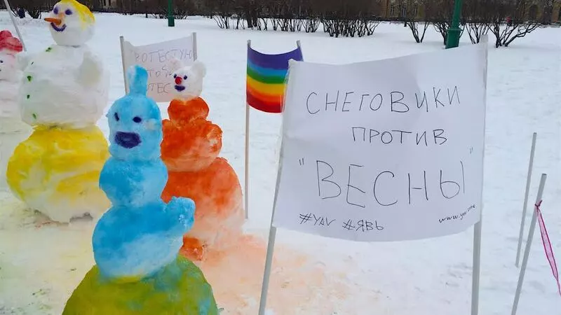 Активисты движения «Явь» устроили в северной сталице арт-акцию «Снеговики против весны». Раскрашенные снежные бабы с транспарантами в «руках» протестовали против наступления весенних месяцев. Таким образом художники-акционисты хотели показать бессмысленность большинства митингов и маршей.