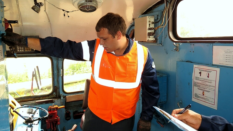 Третий этап проходил на самом маневровом тепловозе. Железнодорожникам нужно было проверить его техническое состояние, не упустив ни одной неисправности, не нарушив правил охраны труда и техники безопасности.