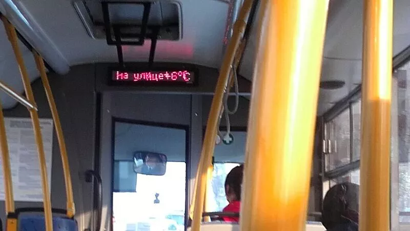 На дисплее, расположенном у кабины водителя, «бегущей строкой» выводится информация о температуре воздуха внутри автобуса и «за бортом», о конечных остановках и времени.