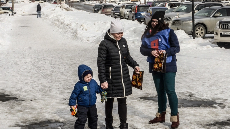 В нескольких людных местах Южно-Сахалинска сегодня островные молодогвардейцы поздравляли жительниц областного центра с Международным женским днем.