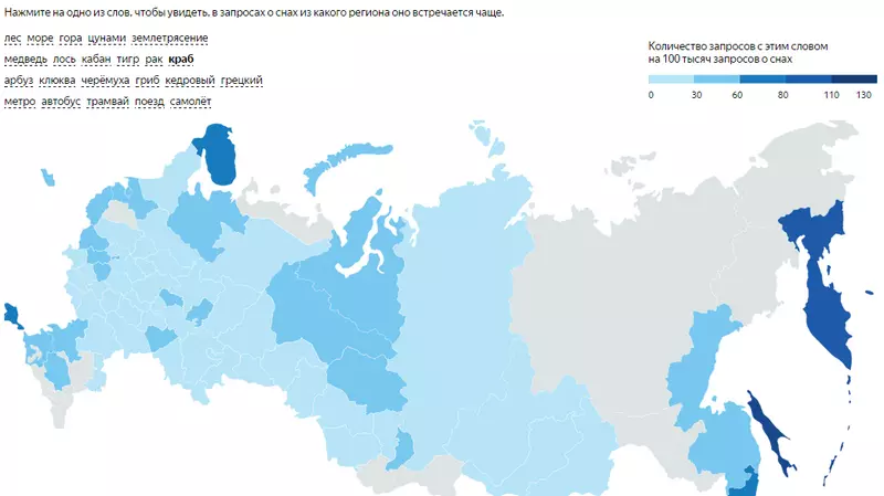 Природа и фауна сновидений, транспорт и погода от региона к региону меняются, утверждается в исследовании. Люди обычно видят во сне тех животных, которые встречаются поблизости и в реальной жизни, и ту природу, которая их окружает. Чтобы проиллюстрировать эту мысль, «Яндекс» предлагает пощелкать по интерактивной карте страны, чтобы «подсветить» те или иные слова из сновидений. Вполне логично, что острова на карте получают максимально яркий окрас на словах «море», «краб», «самолет», но остаются бесцветными на словах «метро» и «трамвай».