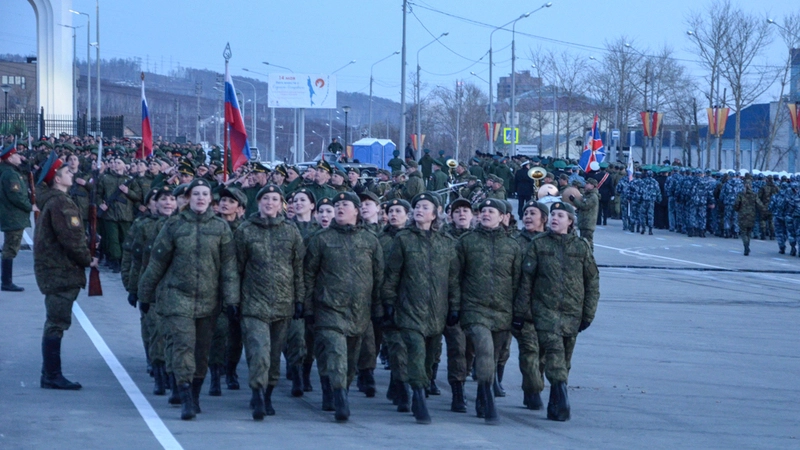 Если не обращать внимания на повседневную одежду военнослужащих, то в остальном все было как на настоящем параде. По площади первыми прошли представители знаменной группы, за ними – рота почетного караула, линейные, оркестр Южно-Сахалинского гарнизона, затем – представители мотострелкового, артиллерийского, танкового, инженерно-саперного батальонов 68-го армейского корпуса, дислоцированного на Сахалине, морские пограничники. 9 Мая по площади пройдут более тысячи участников, сегодня же по брусчатке промаршировали около десяти коробок военных. Остальные, в том числе кадеты, присоединятся позже.