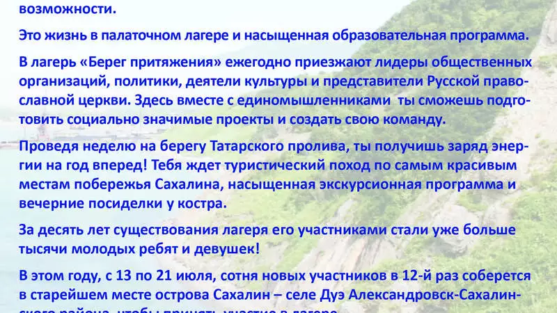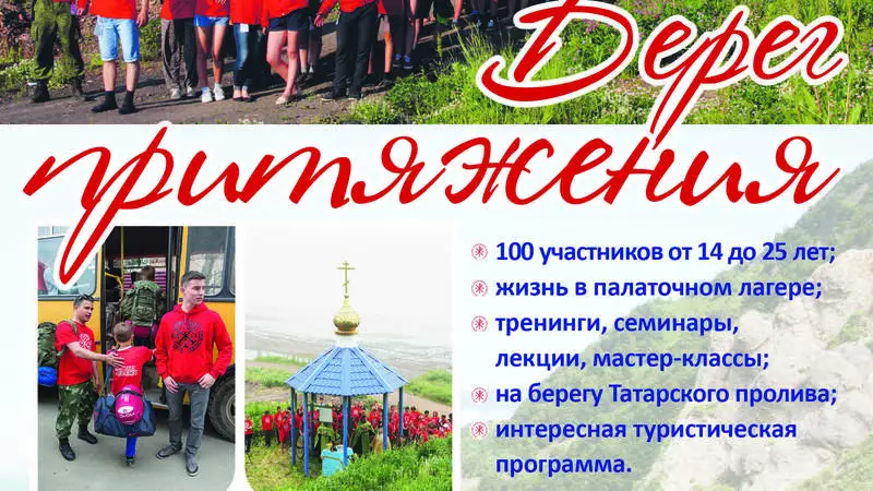 Лагерь организует «Братство Александра Невского» при поддержке регионального правительства и Южно-Сахалинской и Курильской епархии. Организаторы ждут всех, кто неравнодушен к природе и истории нашего острова и интересуется православной культурой. Подробности по телефонам: 26-14-96, 8-914-756-14-96 и по почте sakhbratstvo@mail.ru. «Берег притяжения».