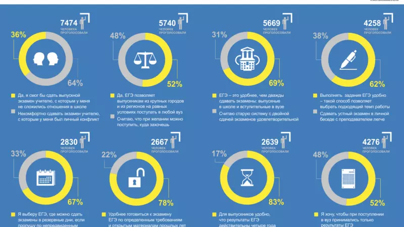 68,6% проголосовавших считают, что единый экзамен как выпускной в школе и вступительный в вузе удобнее, чем прежняя система, когда выпускные и вступительные экзамены были разделены. Для 83,4% участников опроса удобно, что результаты ЕГЭ действительны четыре года. Не имеет значения этот факт для 16,6% ответивших.