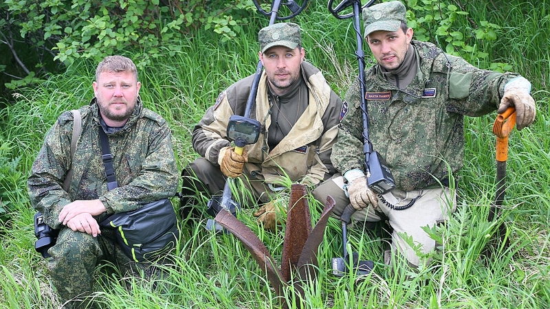 Первый раз мы приехали на этот остров в 2014 году, поисковые работы велись в труднопроходимом стланике. По нему ходить не так-то просто, тем более с металлоискателем и прочим оборудованием. И все же, судя по навигатору, в день мы в среднем преодолевали по 15-20 километров. Приходилось практически все комья земли пропускать через руки, чтобы не упустить именных или личных вещей бойцов.