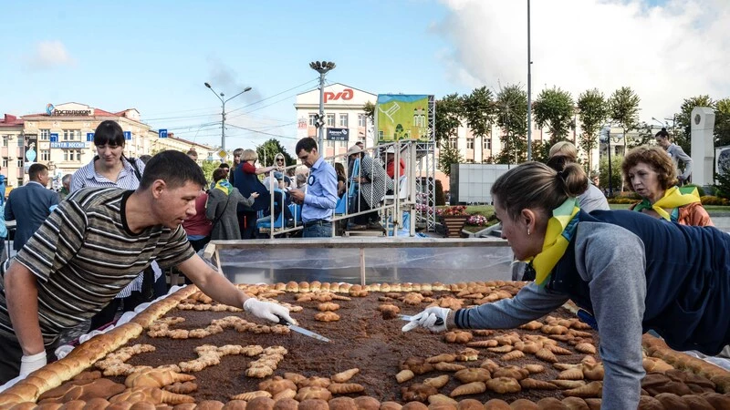 Не забыли организаторы и об именинном угощении. На этот раз им стал 200-килограммовый пирог с яблочным повидлом. Как рассказал корреспонденту РИА «Сахалин-Курилы» представитель Южно-Сахалинского хлебокомбината Андрей Владыкин, мастера предприятия готовили праздничное угощение размерами 2,5 на 2,5 метра несколько часов, а последние штрихи наносили уже на площади.