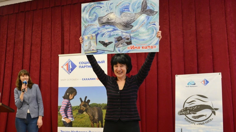 Приятным сюрпризом для детей и их родителей стало то, что организаторы не только объявили победителей, но и сразу получили обратную связь от ученых о присвоении придуманных имен китам. На награждение из Владивостока была приглашена Ольга Тюрнева, автор каталога китов охото-корейской популяции, встреченных у берегов Сахалина за время работы исследовательской программы. Дети торжественно передали гостье список имен для ее подопечных.