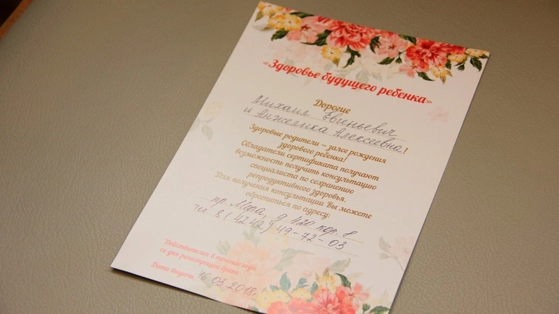 - В будущем мы не представляем свою жизнь без детей, поэтому перед тем, как стать родителями, пройдем полное обследование. Замечательно, что сейчас появилась такая возможность. В удобное время мы можем посетить нужных специалистов и проконсультироваться у них по всем интересующим вопросам, - отметили молодожены из Южно-Сахалинска Михаил и Анжелика Артамоновы. Супруги, которые сегодня зарегистрировали брак, первыми в области получили сертификат «Здоровье будущего ребенка».