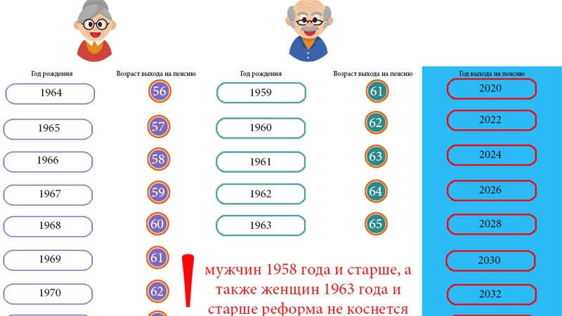Первыми повышение пенсионного возраста затронет мужчин 1959 года рождения и женщин 1964 года рождения: они получат право выйти на пенсию в 2020 году в возрасте соответственно 61 года и 56 лет. Мужчины 1960 г. р. и женщины 1965 г. р. выйдут на пенсию в 2022 году в возрасте соответственно 62 лет и 57 лет. Мужчины 1961 г. р. и женщины 1966 г. р. - в 2024 году в возрасте 63 лет и 58 лет; мужчины 1962 г. р. и женщины 1967 г. р. - в 2026 году в 64 года и 59 лет; мужчины 1963 г. р. и женщины 1968 г. р. смогут выйти на пенсию в 2028 году в возрасте соответственно 65 и 60 лет.