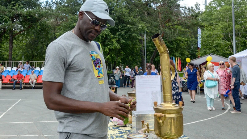 Фил Тумби – уроженец Камеруна – несколько лет прожил в Татарстане, но сейчас с семьей переехал на Сахалин. Он поделился, что на его родине чай (черный и зеленый) также является универсальным средством утоления жажды и заваривают его так же, как в России. На фестивале он решил с дочерьми попробовать таджикский плов.