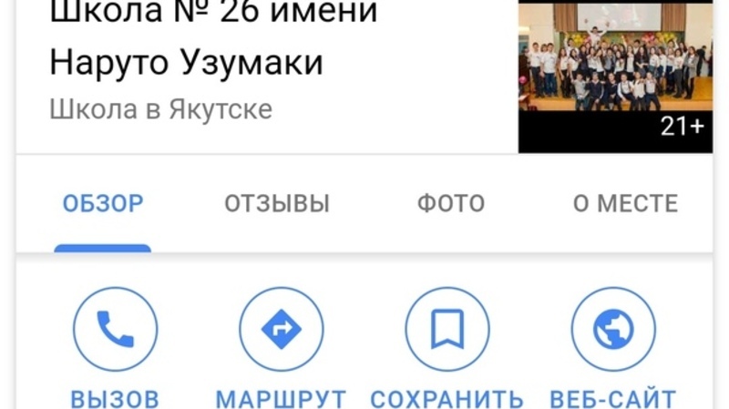 Такая же история в конце декабря 2018 года произошла и с названием школы в Якутске. Из школы № 26 на улице Ярославского, 21 сделали школу имени Наруто Узумаки (главный герой японской манги «Наруто») . Ученики отреагировали и начали писать под интернет-визиткой забавные комментарии по теме. «В этой школе я нашла свой путь шиноби», - оставила реплику Эллиана Ильина. «Лучшая школа, теневых клонов теперь умею делать», - написала другая ученица и оценила заведение в пять звезд. «Благодаря этой школе я смог найти общий язык со своим дзинцюрики», - пошутил третий пользователь. На данный момент название уже поменяли, а вот комментарии так и остались.