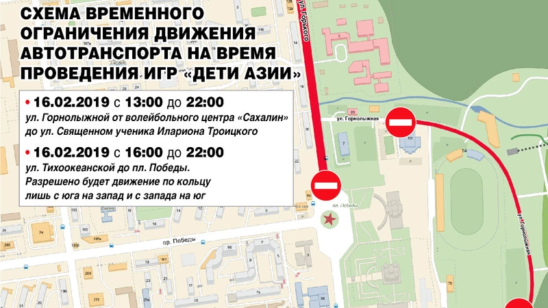 Будет перекрыта улица Горнолыжная, от волейбольного центра «Сахалин» до улицы Священномученика Илариона Троицкого.
