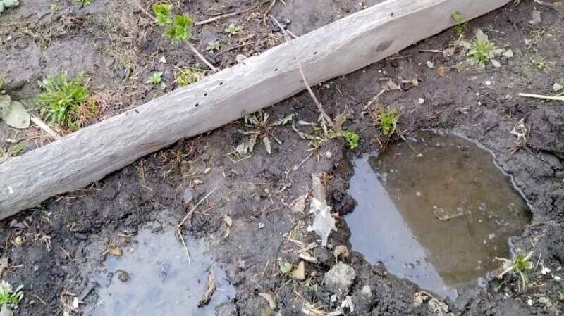 Хозяйка участка Элика Терехова рассказала РИА «Сахалин-Курилы», что проблемы начались еще прошлой осенью, когда представители компании во время установки опоры рядом с ее участком ямобуром пробили дыру в старом водопроводе. Оттуда хлынула вода.