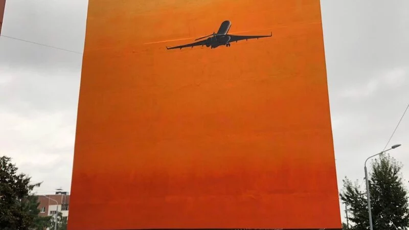 Так, ярко-оранжевое небо и идущий на взлет самолет на фасаде дома № 237 на улице Комсомольской, оказывается, говорит о серьезной проблеме, касающейся не только Сахалинской области, но и всего Дальнего Востока в целом, — оттоке населения. Художник Слава Птрк рисовал картину два дня.