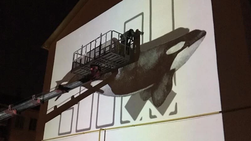 Второе творение — косатка на фасаде дома № 6 на улице Монетной в Дальнем — работа Стаса Багса. На создание картины также ушло два дня и одна ночь. В этом изображении автор зашифровал проблему, которая гремит на всю Россию уже на протяжении полугода — «китовая тюрьма» в Приморском крае. Художник нарисовал большую косатку, а рядом знак «Нет сети», которая появляется на экране мобильника, когда сотовая связь отсутствует.