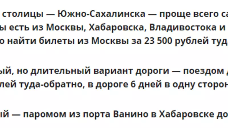 Авторы статьи утверждают, что в Южно-Сахалинск можно попасть разными путями, в зависимости от бюджета. Мол, проще всего добраться в столицу региона на самолете — прямые рейсы, как указано на сайте, отправляются из Москвы, Хабаровска, Владивостока и Новосибирска. Про Благовещенск, откуда на Сахалин лететь всего 2,5 часа, создатель текста, вероятно, позабыл.