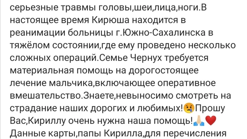 «Друзья, нужна срочная помощь! Днем 28 января 2020 года у наших очень близких друзей случилось большое горе. На мальчика 5 лет Кирюшу Ч. напали бездомные собаки, в связи с чем он получил серьезные травмы головы, шеи, лица, ног. В настоящее время Кирюша находится в реанимации в больнице Южно-Сахалинска в тяжелом состоянии, где ему проведено несколько сложных операций. Семье Ч. требуется материальная помощь на дорогостоящее лечение мальчика, включающее оперативное вмешательство. Знаете, невыносимо смотреть на страдание наших дорогих и любимых! Прошу вас, Кириллу очень нужна наша помощь!» — говорится в сообщении, в котором указаны реквизиты карты для перечисления средств.