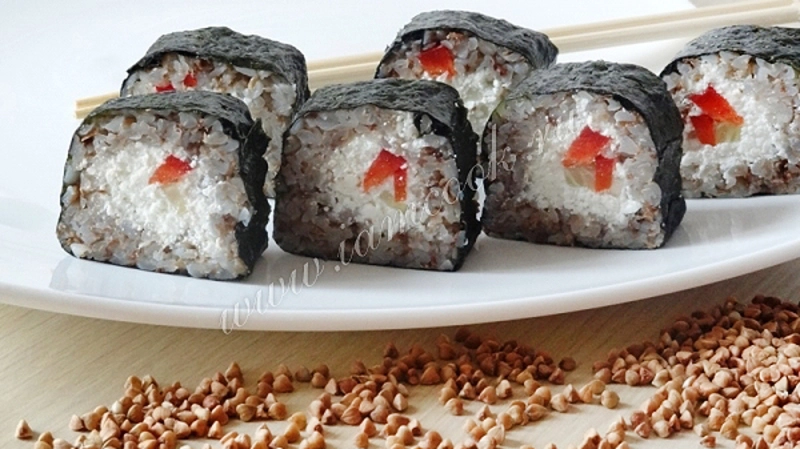 3) Края нори слегка смачиваем водой. После чего выкладываем гречку. После слой творога, а него полоски огурца и перца.