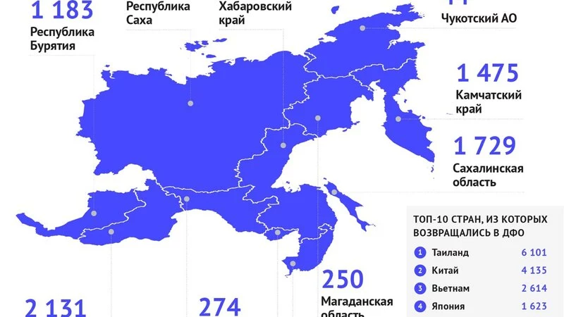 Из дальневосточных регионов больше всего людей вернулось в Приморский край (8441). На последнем месте по количеству прибывших оказался Чукотский автономный округ, куда прилетели всего 44 человека. Самыми популярными странами для дальневосточников стали Таиланд, Китай и Вьетнам.