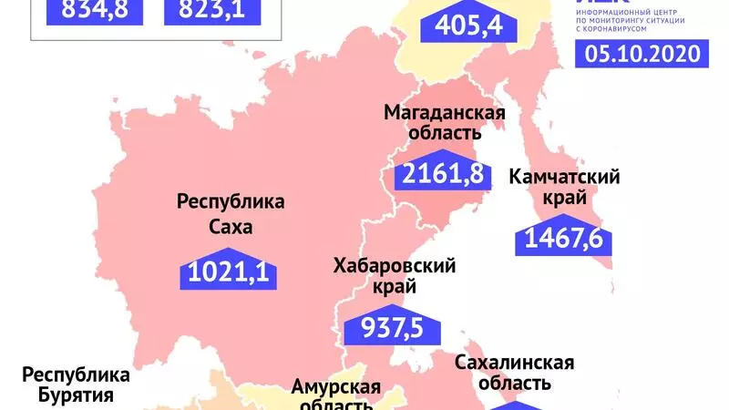 В ДФО, по информации на 5 октября, количество выявленных заболевших COVID-19 на 100 тыс. населения составляет 823,1 случая. По данному показателю ДФО занимает третье место из восьми федеральных округов. Среди регионов Дальневосточного федерального округа тройку лидеров по численности выявленных инфицированных на 100 тыс. населения составляют Магаданская область (2 161,8 выявленных случаев), Камчатский край (1 467,6) и Сахалинская область (1 199,8). Наименьший показатель у Чукотского автономного округа – 405,4.