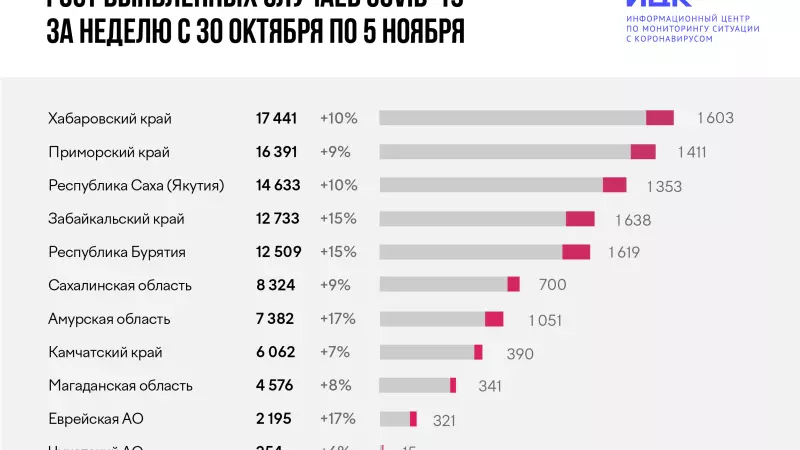 Наибольший прирост в Дальневосточном федеральном округе за неделю наблюдается в Еврейской автономной области и Амурской области, там количество выявленных случаев COVID-19 выросло на 17 %. Наименьший прирост зафиксирован на Чукотке — 6 %.