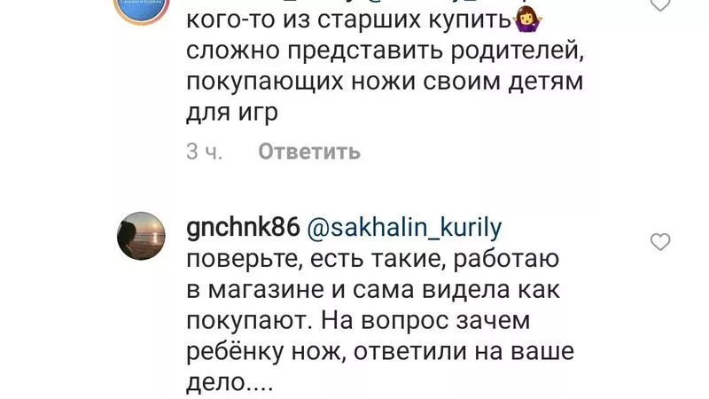 Факт опасных забав вскрылся после публикации в официальном Instagram-аккаунте РИА «Сахалин-Курилы» новости о нападении восьмилетнего мальчика с ножом на одноклассника. Пользователи рассказали, как дети собираются во дворах и повально крутят бабочки пальцами. И хотя эти истории напрямую не связаны друг с другом — в материалах уголовного дела значится обычный кухонный нож — повод задуматься о безопасности таких «хобби» есть.