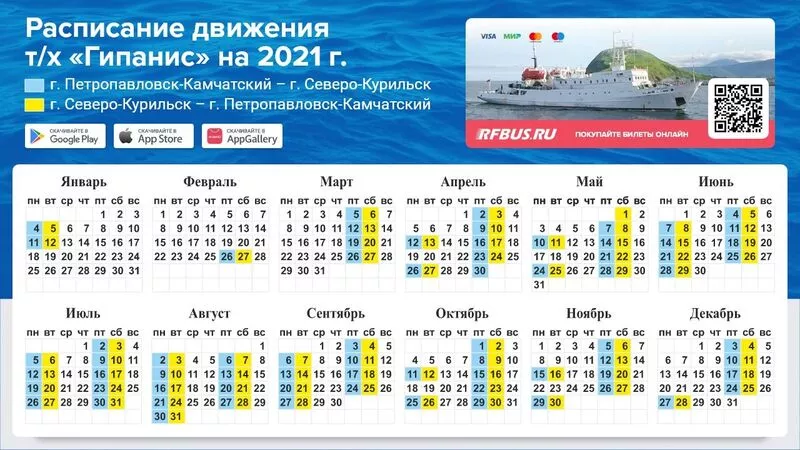 Федеральная транспортная система RFBUS.RU объявила о старте продажи билетов на теплоход «Гипанис» на 2021 год. Ожидается, что судно, которое связывает Северо-Курильск и Петропавловск-Камчатский, совершит 72 оборотных рейса.