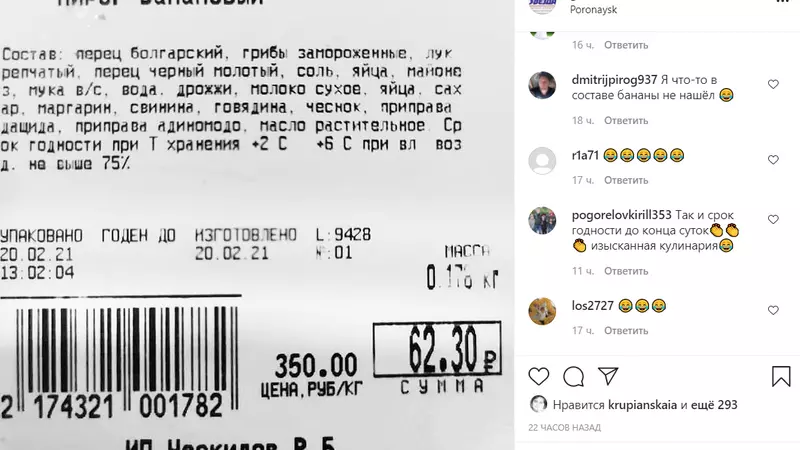 Настоящий рецепт бананового пирога раскрыли в Поронайске. Местная жительница купила десерт, в описании которого говорится, что состоит он из грибов, маргарина, свинины и прочих странных ингредиентов. Очередная ошибка местных супермаркетов повеселила сахалинцев.