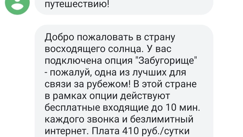 «Добро пожаловать в Страну восходящего солнца! У вас подключена опция «Забугорище», — информирует провайдер.