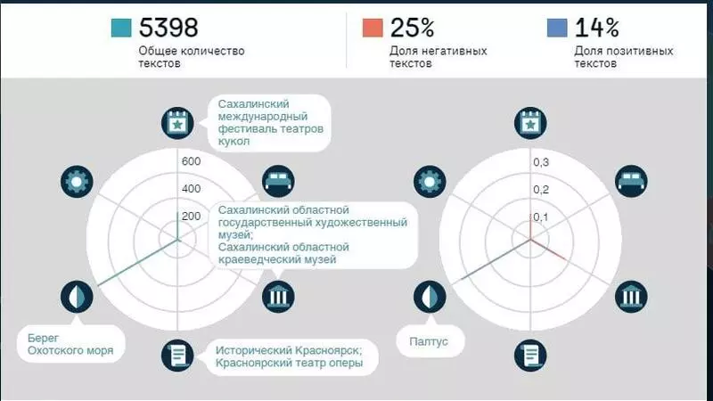 Специалисты изучили тексты российских путешественников о впечатлениях от регионов в 2019 году. Сахалину было посвящено 5 398 текстов, 20 процентов из них оказались негативными, и только 14 процентов рассказывали о регионе положительно. Чаще всего российские туристы говорили хорошо о побережье Охотского моря, сахалинском палтусе и прошедшем международном фестивале театра кукол. Однако путешественники не удовлетворены малым количеством объектов, которые можно посетить.