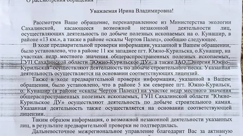 При этом жительница Кунашира просила не проверить законность работы организаций, а защитить заповедные места от вторжения промышленников. В конце письма ее поблагодарили за активную гражданскую позицию и попросили «в дальнейшем не оставаться безразличной к сохранению благоприятной окружающей среды и к обеспечению экологической безопасности».