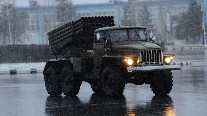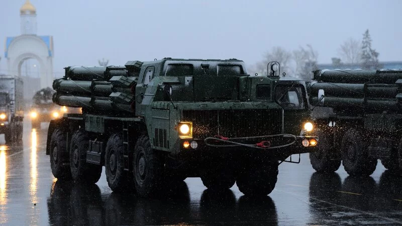 Система реактивного залпового огня БМ 9П148 РСЗО «Ураган». Огнестрельная техника калибра 220-мм способна перемещаться со скоростью до 70 километров в час и поражать цели на дальности до 35 километров.
