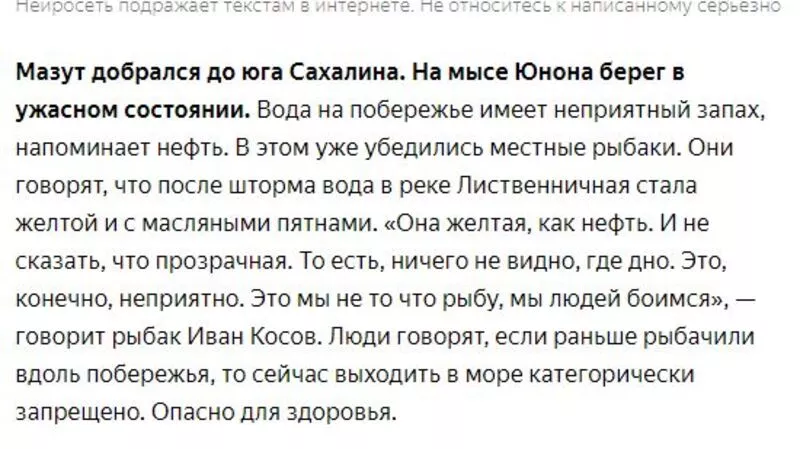 РИА «Сахалин-Курилы» поставило эксперимент и предложило нейросети заголовки сахалинских новостей последних дней. Сервис продолжил тексты. Получилось не всегда правильно, зато довольно смешно.