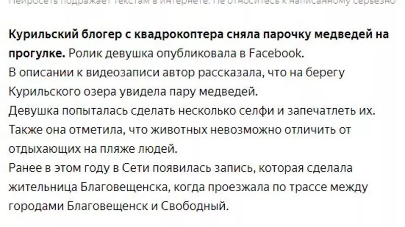 А вот в новости про медведей, которых блогер сняла на видео на Курилах, нейросеть повеселилась — в сгенерированном тексте сообщается, что животных невозможно отличить от отдыхающих на пляже людей.