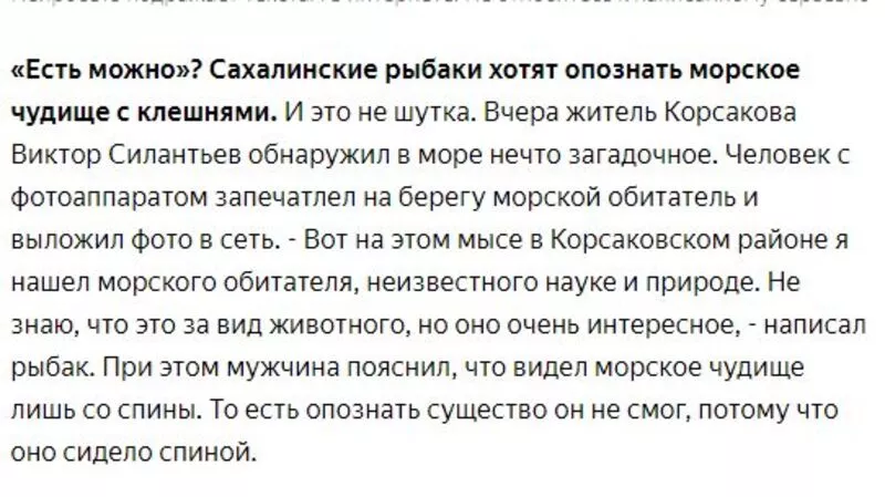 Напоследок — новость о морском чудовище, которое не смогли опознать сахалинцы. Оно сидело спиной, все дело в этом, уверена нейросеть.