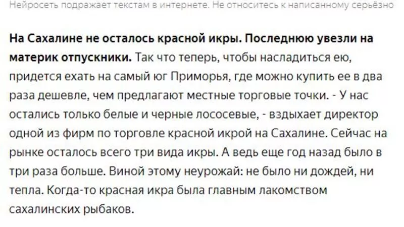 В новости про икру нейросеть посетовала на неурожай из-за отсутствия дождей.