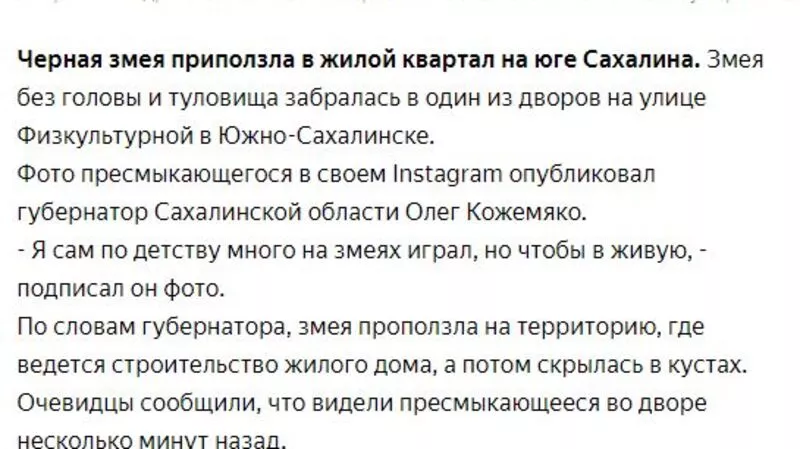 В новости про змею, напугавшую сахалинцев, сервис «Яндекса» перепутал губернаторов, а сама змея оказалась «без головы и туловища».