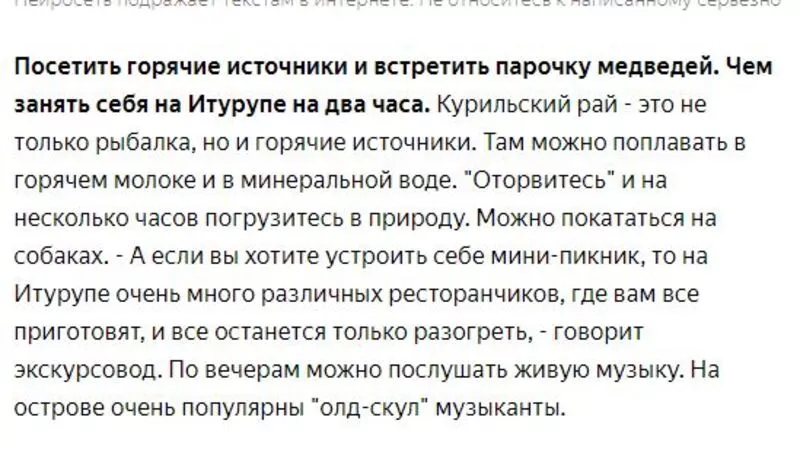 Предложил сервис и свое видение отдыха на Итурупе. Нейросеть считает, что на острове можно поплавать в горячем молоке и минеральной воде.