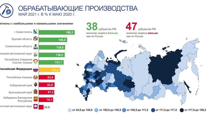 Если смотреть в целом по стране, то наибольший рост показали отрасли, связанные с водоснабжением и водоотведением, а также утилизацией отходов и ликвидацией загрязнений. Они выросли на 23,8%. Добывающие отрасли показали рост около 12%, обрабатывающие производства выросли на 11,4%, а энергетический сектор, тепло- и газоснабжение — на 8,7%.