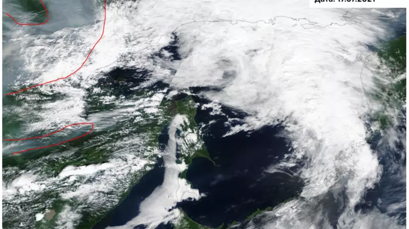 Смещение дымовой завесы в атмосфере, вид из космоса. Фото: министерство экологии Сахалинской области