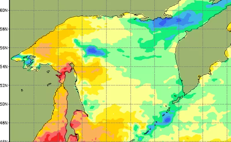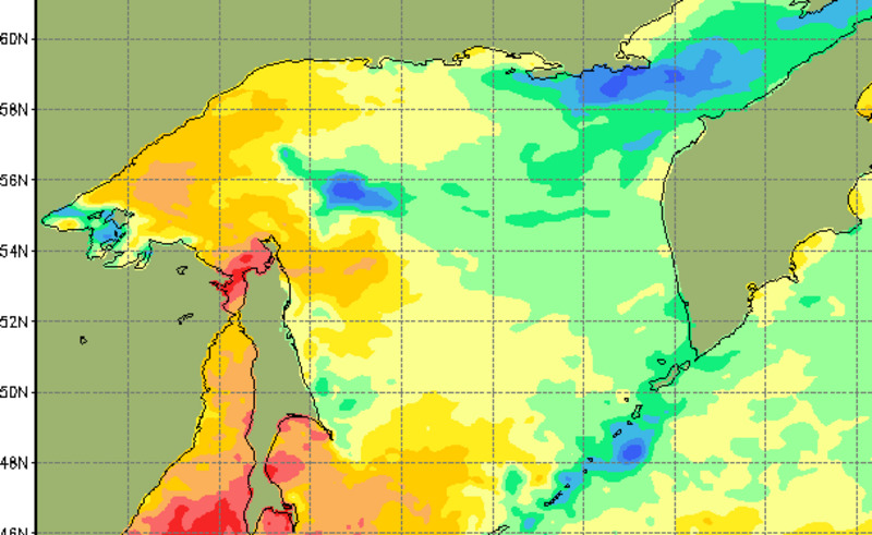 Оценки сахалинских океанологов подтверждают и данные Гидрометцентра России. Судя по карте температуры поверхности морей, размещенной на сайте ведомства, со стороны Японского моря вода прогрелась до +22 градусов, в некоторых районах столбик термометра поднялся до отметки +24. Охотское море радует сахалинцев еще больше — там максимальная температура достигла +26 градусов. Согласно карте, теплое течение затронуло северную, южную и центральную часть острова. На сайте Гидрометцентра карта с информацией за прошедшие сутки обновляется ежедневно около 4 часов по всемирному скоординированному времени, совпадающему со временем по Гринвичу.