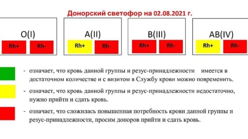 Специалисты говорят, что причинами сокращения числа доноров могли стать не только сезон отпусков, но и вакцинация от коронавируса, так как после прививки кровь нельзя сдавать еще месяц. В официальном Instagram-аккаунте службы крови Южно-Сахалинска каждый день публикуют графики донорских светофоров. По состоянию на утро 2 августа наблюдался острый дефицит крови всех групп и резусов. За день работы удалось немного исправить ситуацию и пополнить запасы, но большая потребность в крови по-прежнему сохраняется. В министерстве здравоохранения Сахалинской области уточнили, что ситуацию нельзя назвать критической.