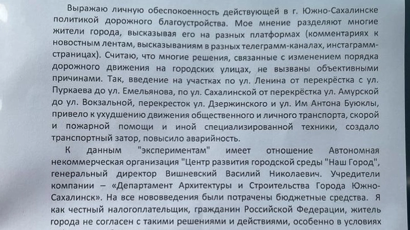 Фотокопия письма, адресованного прокурору столицы Сахалина Антону Коленченко, появилась в Instagram-паблике @sakhalin_fisher. Автор обращения, по его словам, выражает «личную обеспокоенность действующей в Южно-Сахалинске политикой дорожного благоустройства» и считает, что «многие решения, связанные с изменением порядка дорожного движения на городских улицах, не вызваны объективными причинами». Горожанин уверен, что введение этих решений привело к повышению аварийности и созданию транспортных заторов.