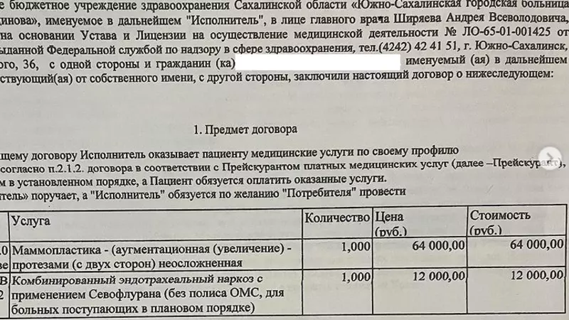 Жительница Южно-Сахалинска, несколько месяцев страдающая из-за неудачного увеличения груди, смогла добиться от больницы, в которой ей провели пластическую операцию, возвращения договора. Однако девушка утверждает, что это совершенно другой документ, в котором неверно указаны даты, название операции и сумма.