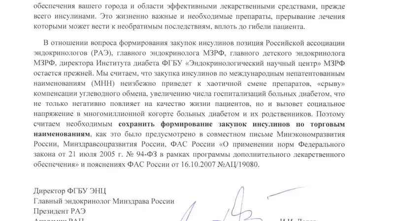 «Мы считаем, что закупка инсулинов по международным непатентованным наименованиям (МНН) неизбежно приведет к хаотичной смене препаратов, «срыву» компенсации углеводного обмена, увеличению числа госпитализаций больных диабетом, что не только негативно повлияет на качество жизни пациентов, но и вызовет социальное напряжение в многомиллионной когорте больных диабетом и их родственников», — приводится текст письма ЭНЦ на официальном сайте учреждения.