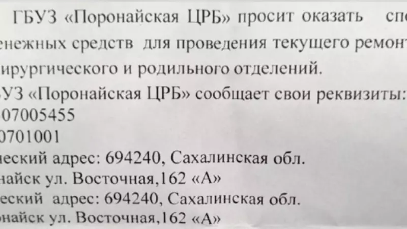 Обращение с просьбой помочь с ремонтом появилось в Телеграм-канале «Поронайская звезда». В нем, в частности, главврач Людмила Куимова от лица ГУБЗ «Поронайская ЦГБ» просит «оказать спонсорскую помощь в виде денежных средств для проведения текущего ремонта в операционных блоках хирургического и родильного отделений». Ниже указагны реквизиты, куда перечислять денежные средства.