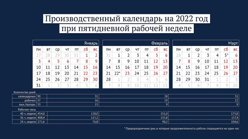 В феврале нерабочим днем будет 23-е число, в марте россияне будут отдыхать 6-го, 7-го и 8-го числа, а 5 марта станет сокращенным рабочим днем.