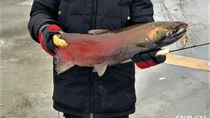 Рыбак-любитель поймал в Ногликском районе крупного кижуча красного цвета. Островитянин удивился своей добыче — такую рыбу ему еще не удавалось поймать по первому льду.