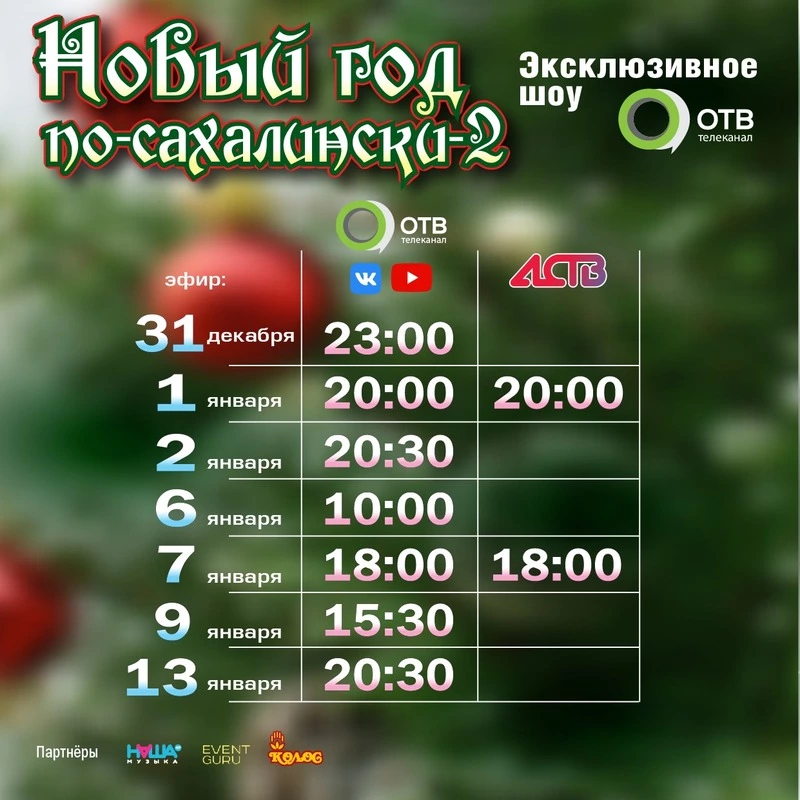 На Сахалине в новогоднюю ночь выйдет в эфир эксклюзивное шоу «Новый год по-сахалински 2». Производством программы занимается телекомпания ОТВ — все детали проекта держатся в строжайшем секрете, однако организаторы обещают яркое зрелище и сюрпризы для зрителей.