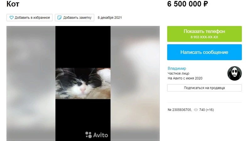 Как сообщает «Тульская пресса», кота выставили на продажу в Богородицке Тульской области за 6,5 млн рублей.